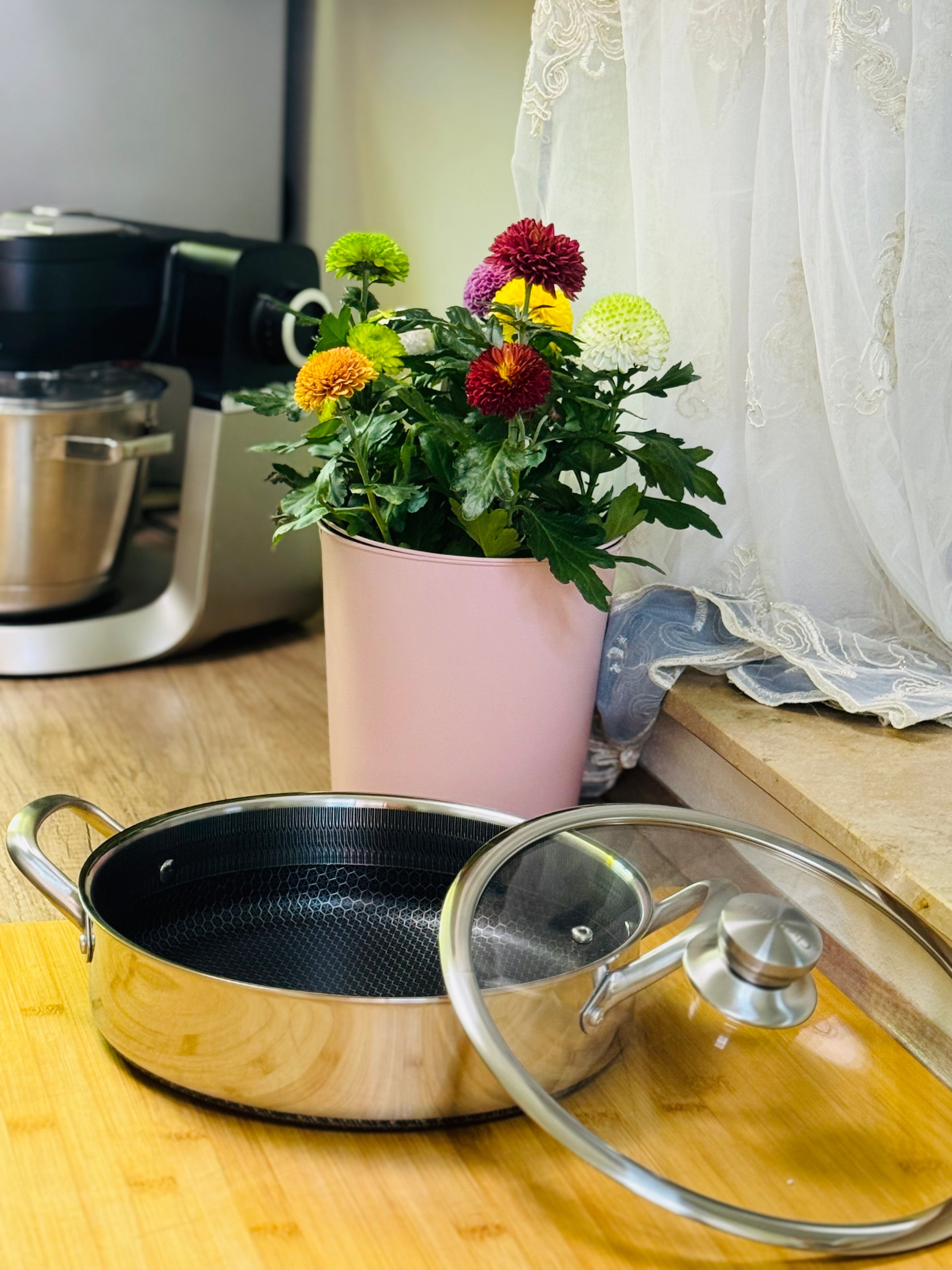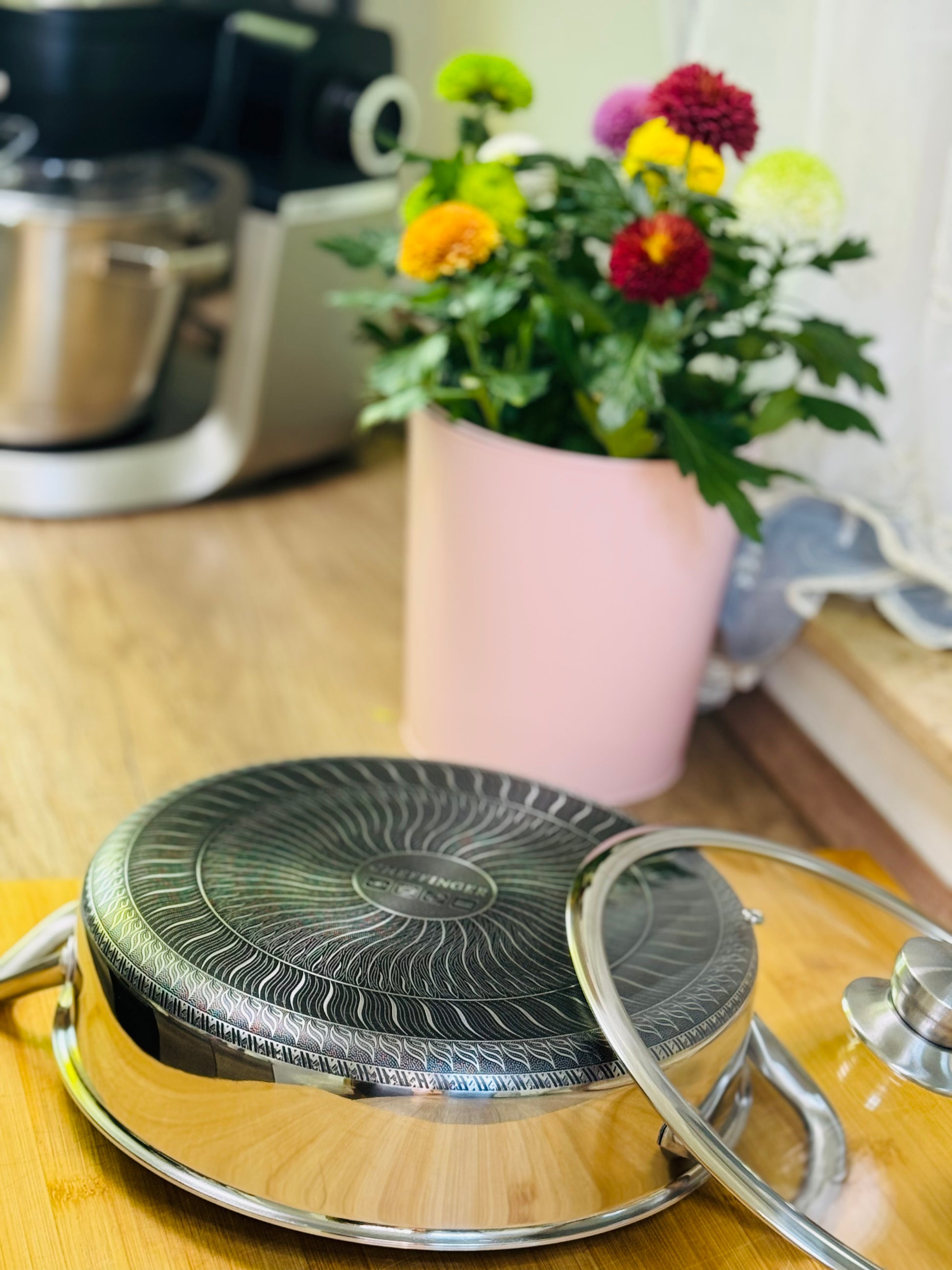 • 👁️ Capac din sticlă termorezistentă cu margine din inox – control ușor asupra preparatelor