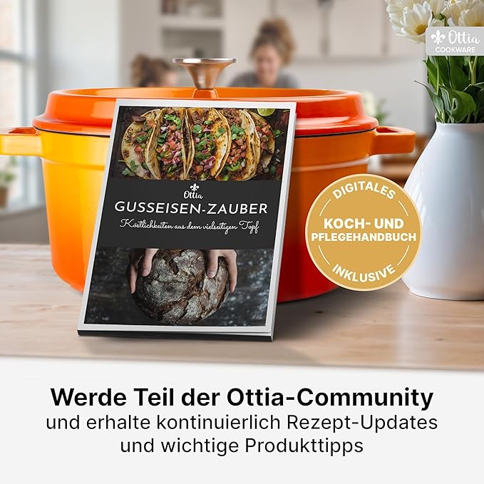 Ottia este unică: Emailul aplicat manual în 3 straturi protejează oala ta din fontă și mâncarea ta. Comunitatea noastră de gătit adaugă constant noi rețete pentru cartea de rețete digitală inclusă.