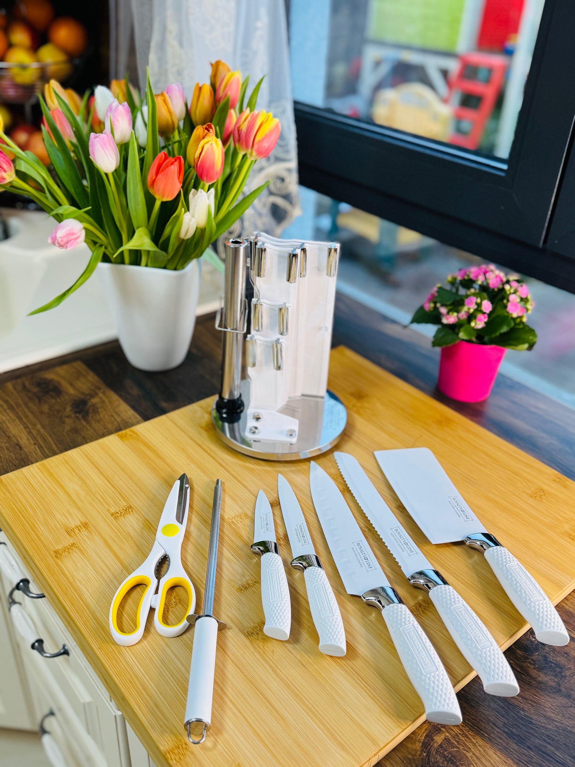 - Suport pentru cuțite: Setul include un suport elegant pentru depozitarea cuțitelor, economisind spațiu și menținându-le la îndemână.