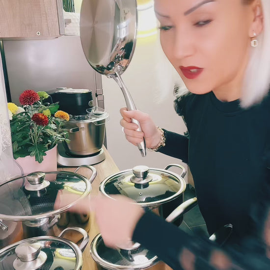Întregul set este compatibil cu toate tipurile de surse de căldură, inclusiv inducție. 🔥 Capacele din sticlă securizată vin cu un buton din oțel inoxidabil, oferind un plus de siguranță și confort.