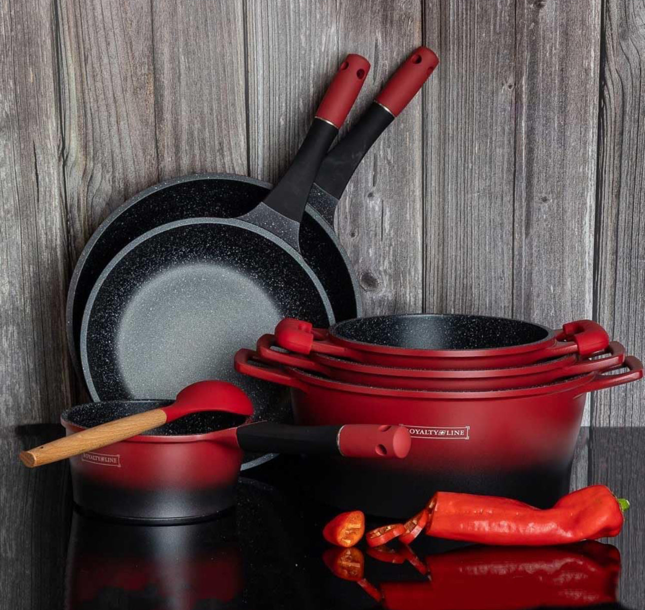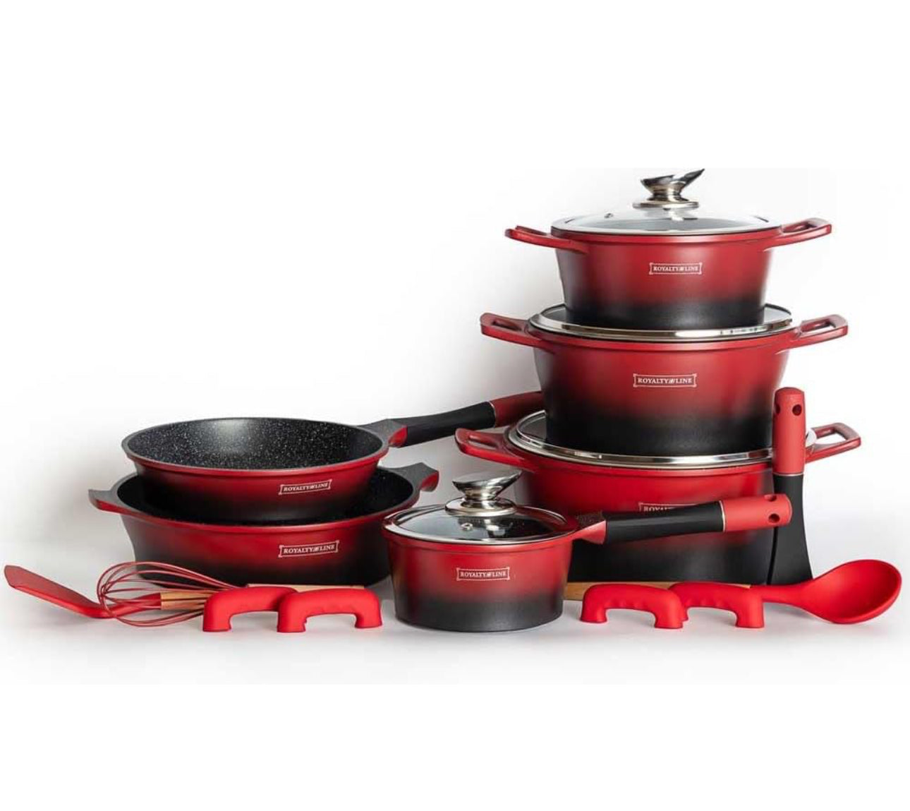 *Set de Vase de Gătit Royalty Line - 17 Piese Marmor Antiaderent - Roșu cu Negru în Degrade**