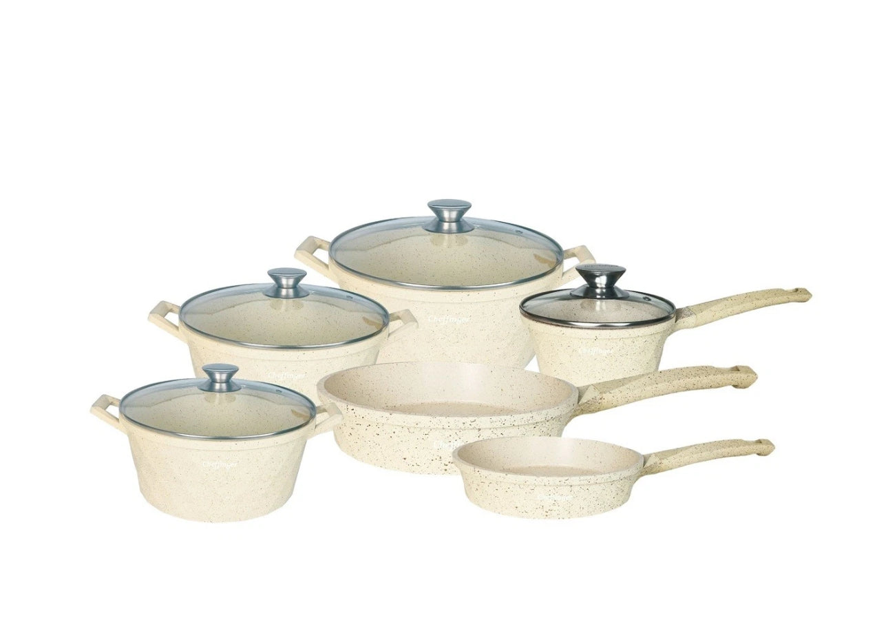 Transformă fiecare sesiune de gătit într-o experiență plăcută cu setul de oale și tigăi Cheffinger, format din 12 piese esențiale pentru orice bucătărie modernă. Fabricat din aluminiu turnat sub presiune și prevăzut cu o acoperire antiaderentă de marmură în 3 straturi, acest set îți oferă durabilitate, eficiență termică și un design elegant tip diamant.