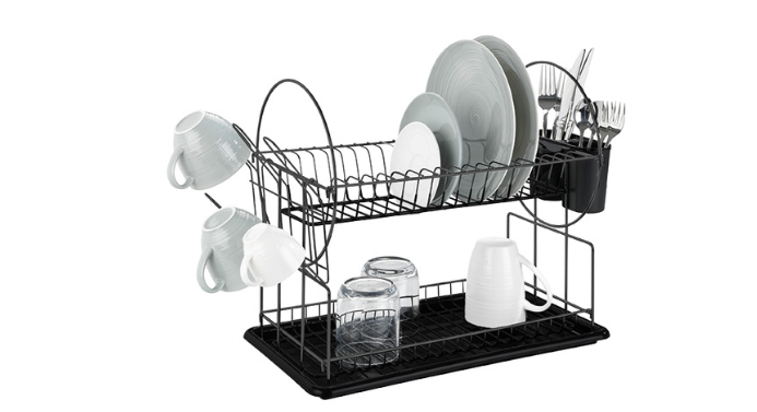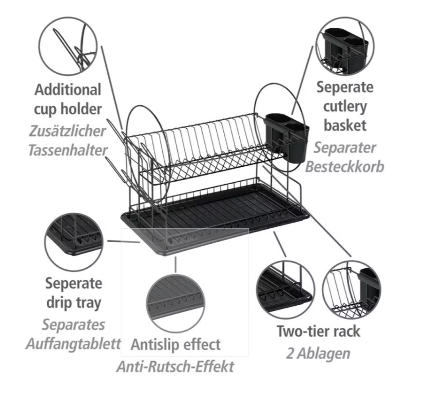 Accesoriile pentru casă de culoare neagră sunt tot mai populare – acum este timpul ca și bucătăria să capete un aer industrial. Coșul pentru scurs Premium Duo, cu două nivele, vine într-o variantă complet neagră și va deveni cu siguranță un punct de atracție pe blatul din bucătăria dumneavoastră! Suportul de vase de înaltă calitate Premium Duo, cu tavă de colectare separată, previne formarea apei și ajută la prevenirea petelor de calcar pe suprafața chiuvetei. Deoarece, chiar și în era mașinilor de spălat vase, există încă vase și tacâmuri care trebuie spălate manual, acest suport devine un accesoriu funcțional pentru chiuvetă în bucătărie, în foișor sau în autorulotă. Cu două rafturi, suportul pentru vase cu strat exclusiv de plastic și efect anti-alunecare oferă mult spațiu pentru farfurii, cești sau pahare. Coșul de tacâmuri se fixează lateral pe raft. Pe cealaltă parte, suportul Premium pentru vase dispune de suporturi suplimentare pentru cești. Pe tava inferioară se pot așeza și alte cești sau pahare. Astfel, blatul rămâne mereu uscat.