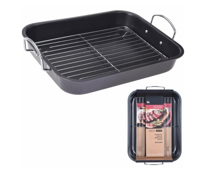 Prepară cele mai delicioase fripturi și legume la cuptor cu această tavă de friptură practică și durabilă, dotată cu grill interior și două mânere laterale pentru manevrare ușoară.